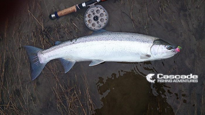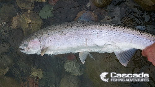 Today’s steelhead is brought to you by words that start with “S” – such as stubborn steelhead and possibly even scarce steelhead. The Chilliwack/Vedder river is in ‘primo’ condition – great water levels with a nice tint of colour to the water make it look and fish, ideal. Out on the prowl today produced three great whites (rocky mountain whitefish) and this
